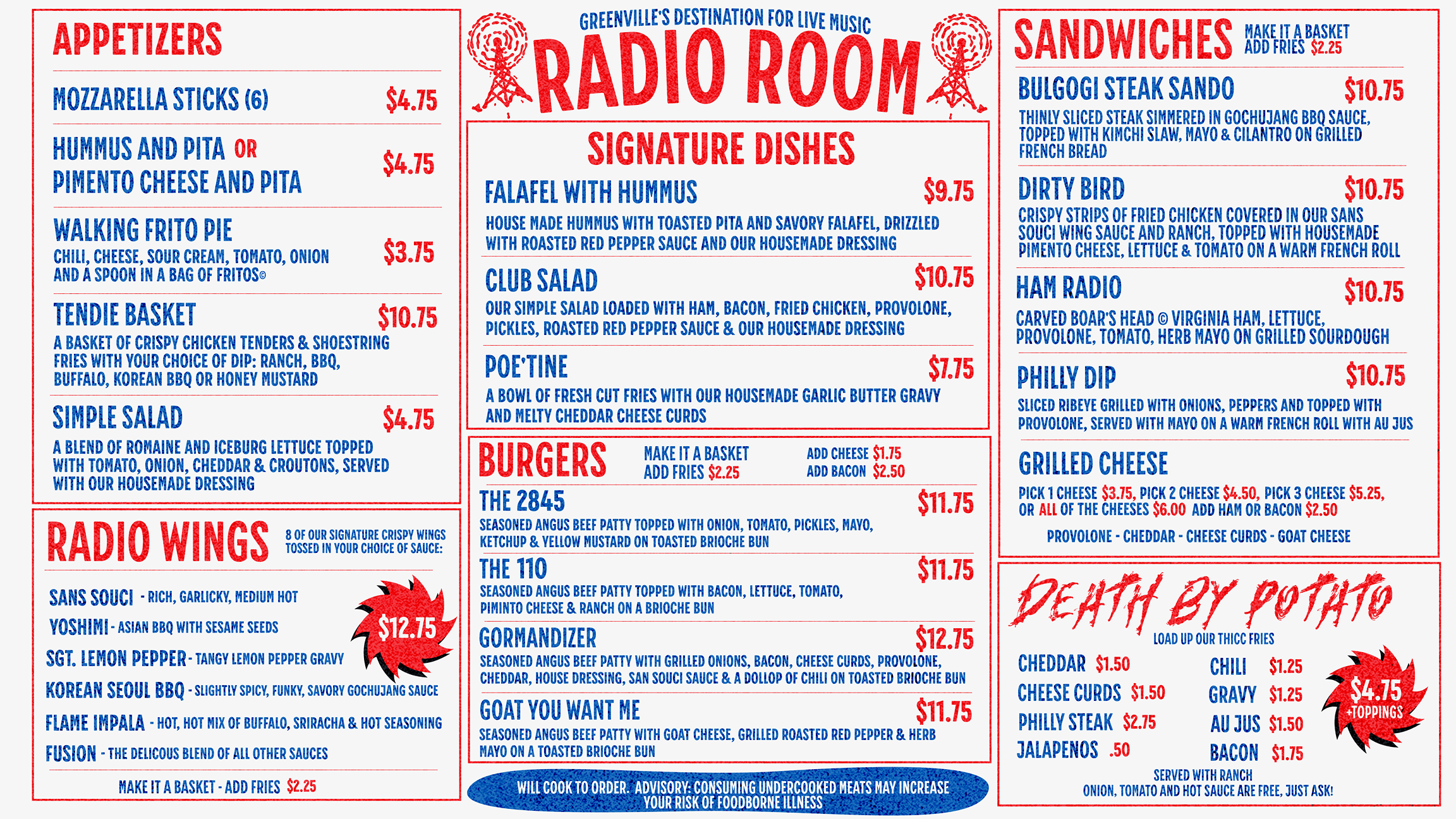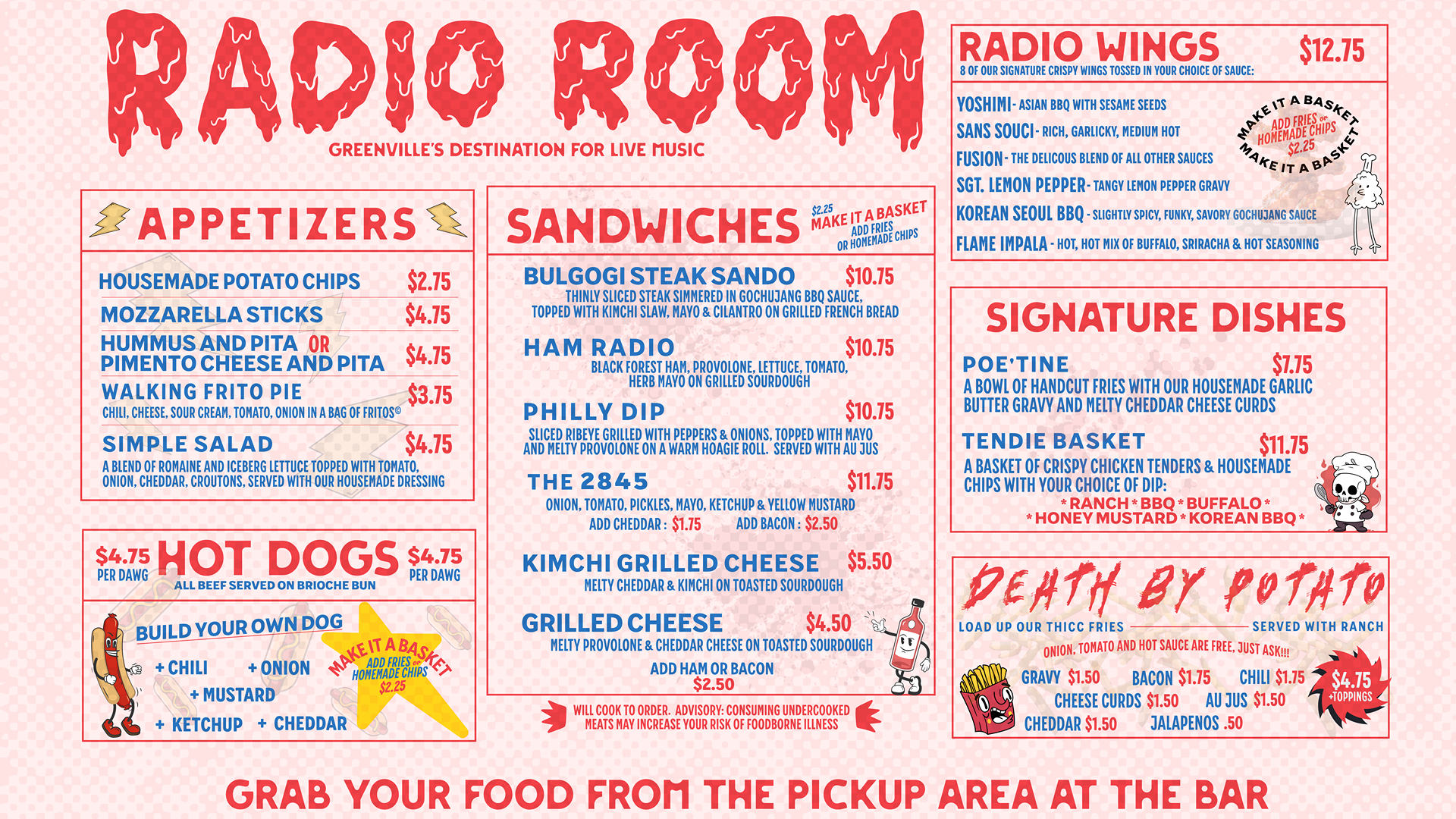 The menu will be limited during larger shows due to kitchen capacity. Hungry for the full menu? Hit us up on trivia nights, karaoke nights, or a no-show night when the kitchen isn’t in battle mode. The kitchen closes at 10pm on all show dates regardless of start time.